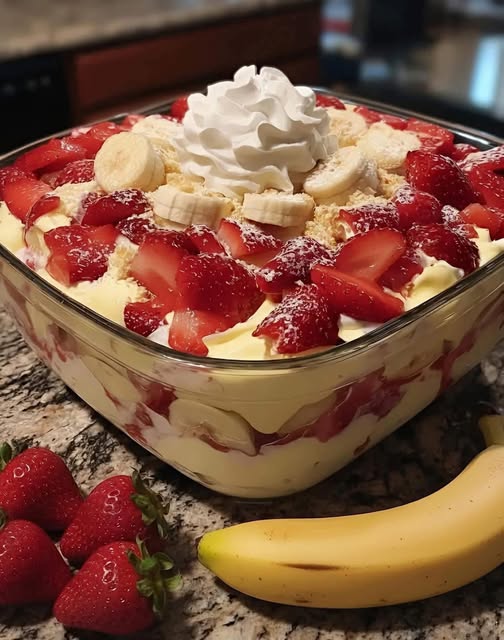 Strawberry Banana Pudding is a creamy, layered dessert that combines fresh fruits, custard or pudding, and cookies or cake layers.
