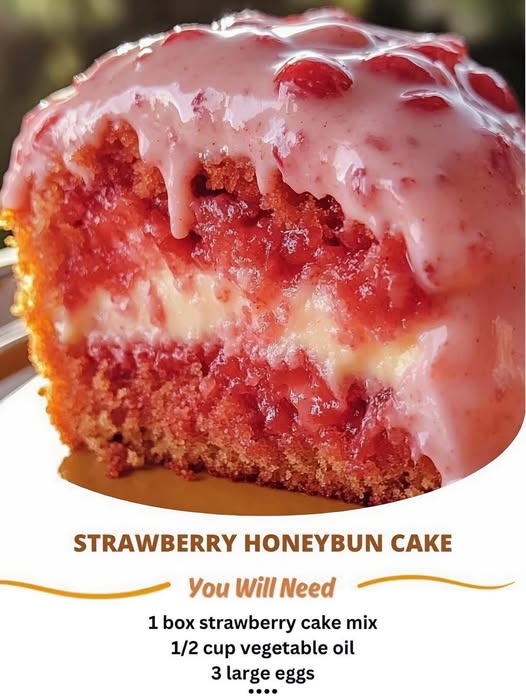 This Strawberry Honeybun Cake is a moist and flavorful dessert layered with cinnamon-sugar, diced strawberries, and topped with a creamy