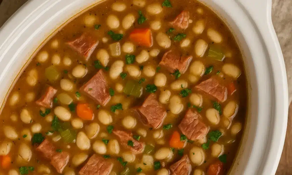 This slow cooker ham and beans soup is what to cook on a chili day. It takes just minutes to