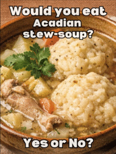 It isn’t flashy. It isn’t precise. It doesn’t follow rules the way modern recipes demand. Fricot is a stew-soup, a bowl of hot broth and potatoes and chicken — but what makes it unforgettable are the poutines râpées, soft, pillowy dumplings that swell gently in the pot, turning something simple into something sustaining.
