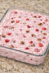 Step 3: The Fruit and Nut Toss: Gently fold in the finely diced strawberries and the 1/2 cup of chopped pecans. The strawberries will naturally release a tiny bit of juice, tinting the entire mixture a beautiful, pale blush pink.