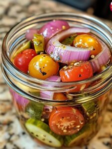 These pickled cherry tomatoes, red onions, and cucumbers are a delicious and versatile side dish that can be enjoyed with a variety of meals. The bright colors and tangy flavor make them a perfect accompaniment to grilled meats, salads, or sandwiches.